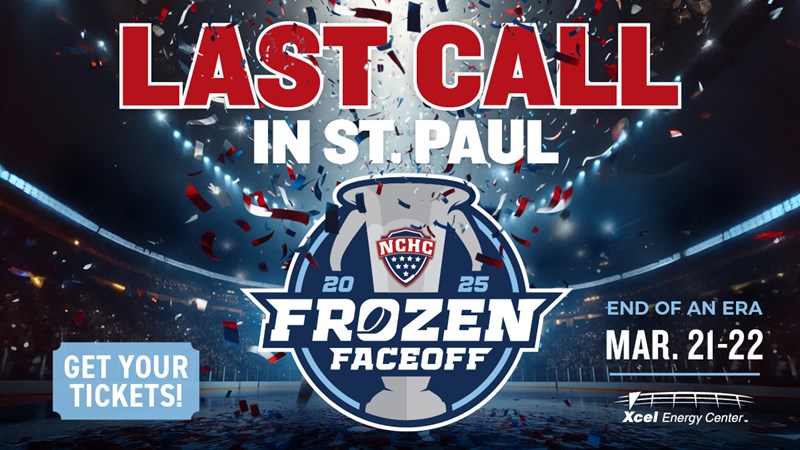 The NCHC’s 11th annual championship weekend is set for March 21-22, 2025 and for the final time will be held at Xcel Energy Center, the home of the NHL’s Minnesota Wild, in Saint Paul, Minn. The NCHC has held five previous Frozen Faceoff championships at Xcel Energy Center since 2018, with the 2025 tournament the final one in Saint Paul. The NCHC is moving its entire championship tournament, including semifinals and championship game, to